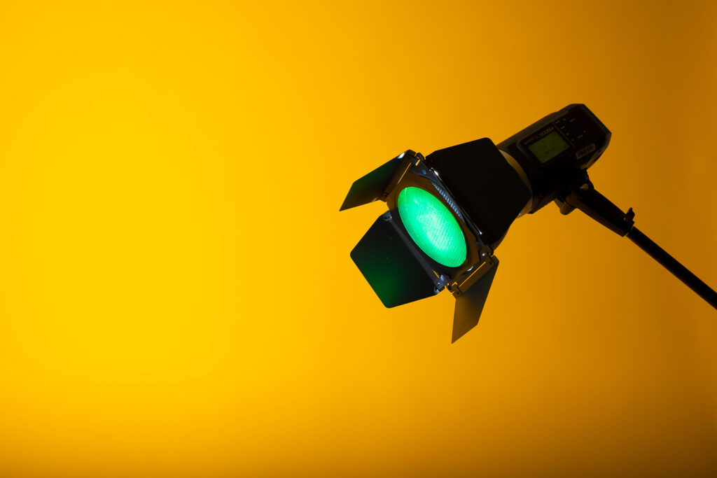 photography studio space with two tripods and two studio lights on them. there is a man between the two tripods