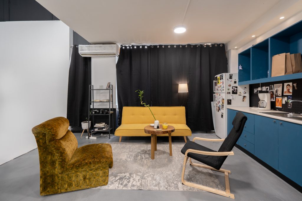 Some Props: mirror surface for portraits and more, 3x vintage chairs, cubes white and blue, 3 x bar stools, handmade table, 1 x yellow sofa and more