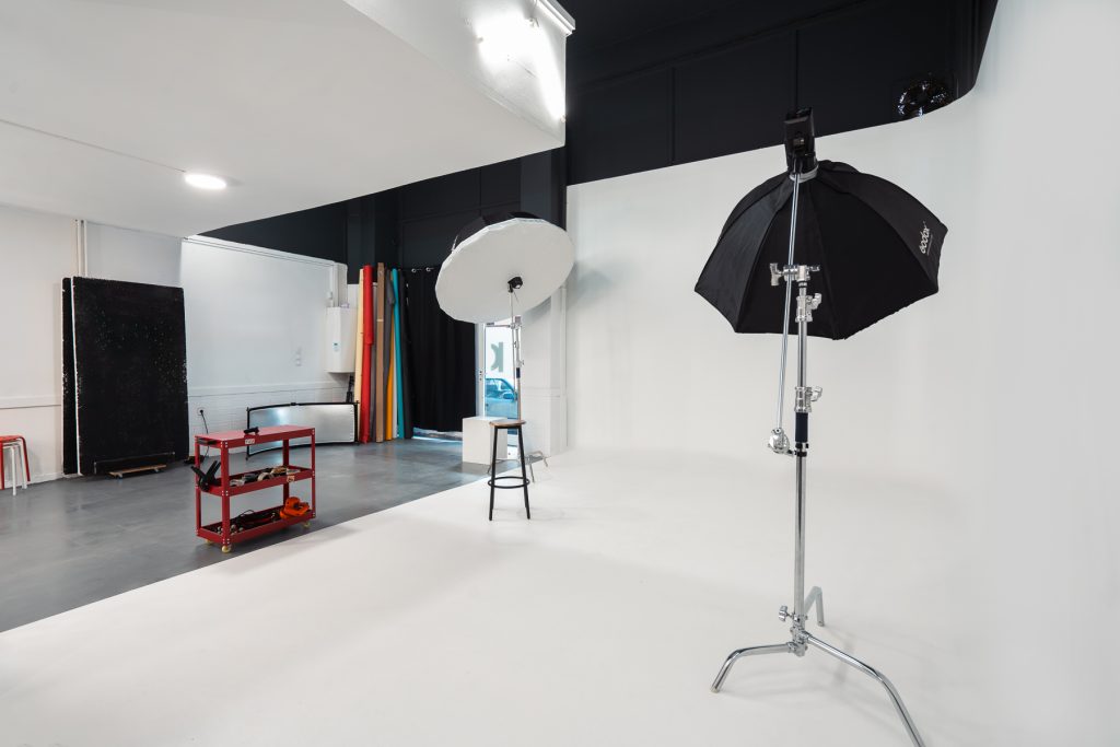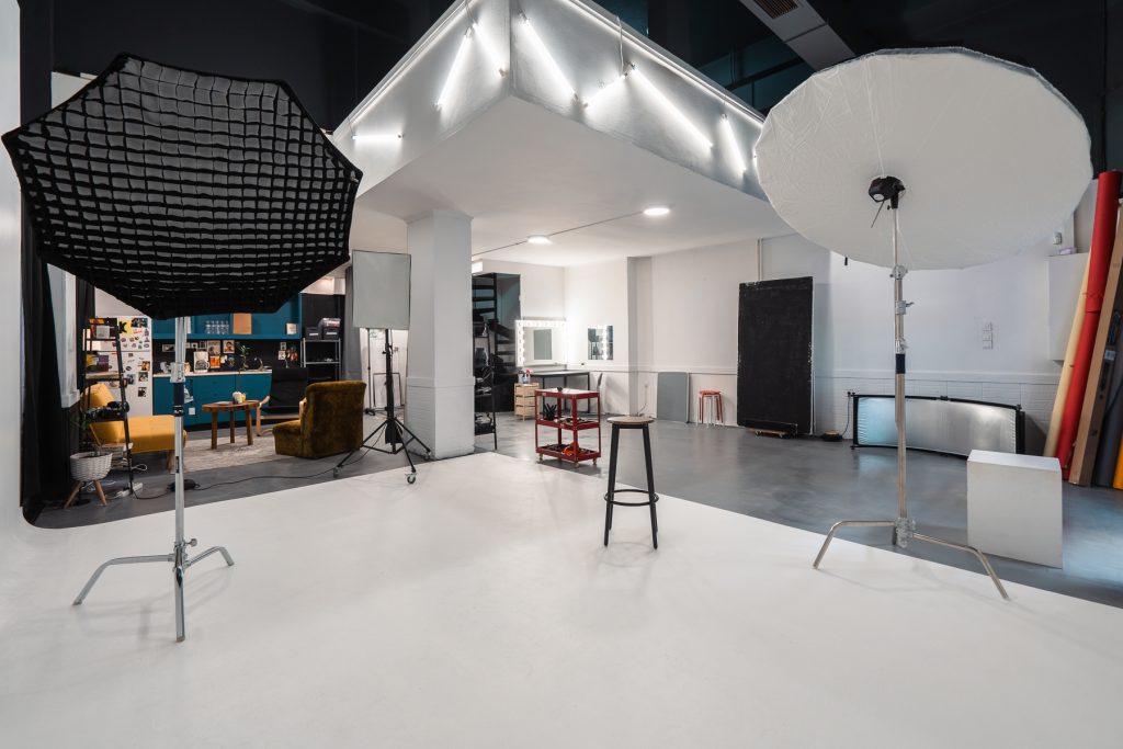 photography studio space with two tripods and two studio lights on them